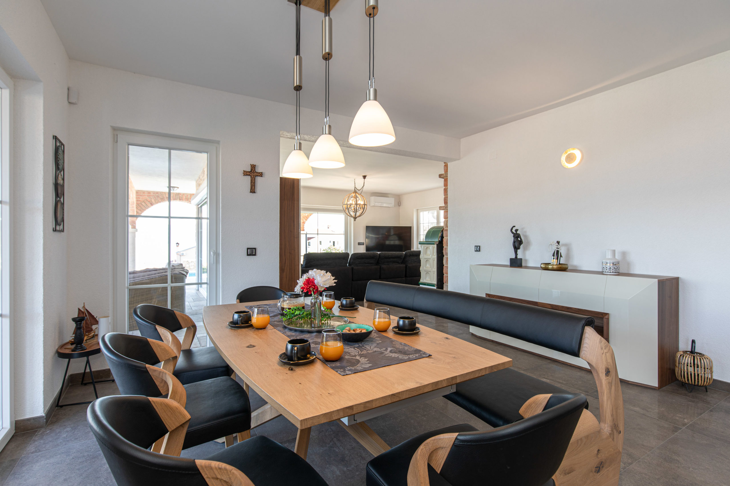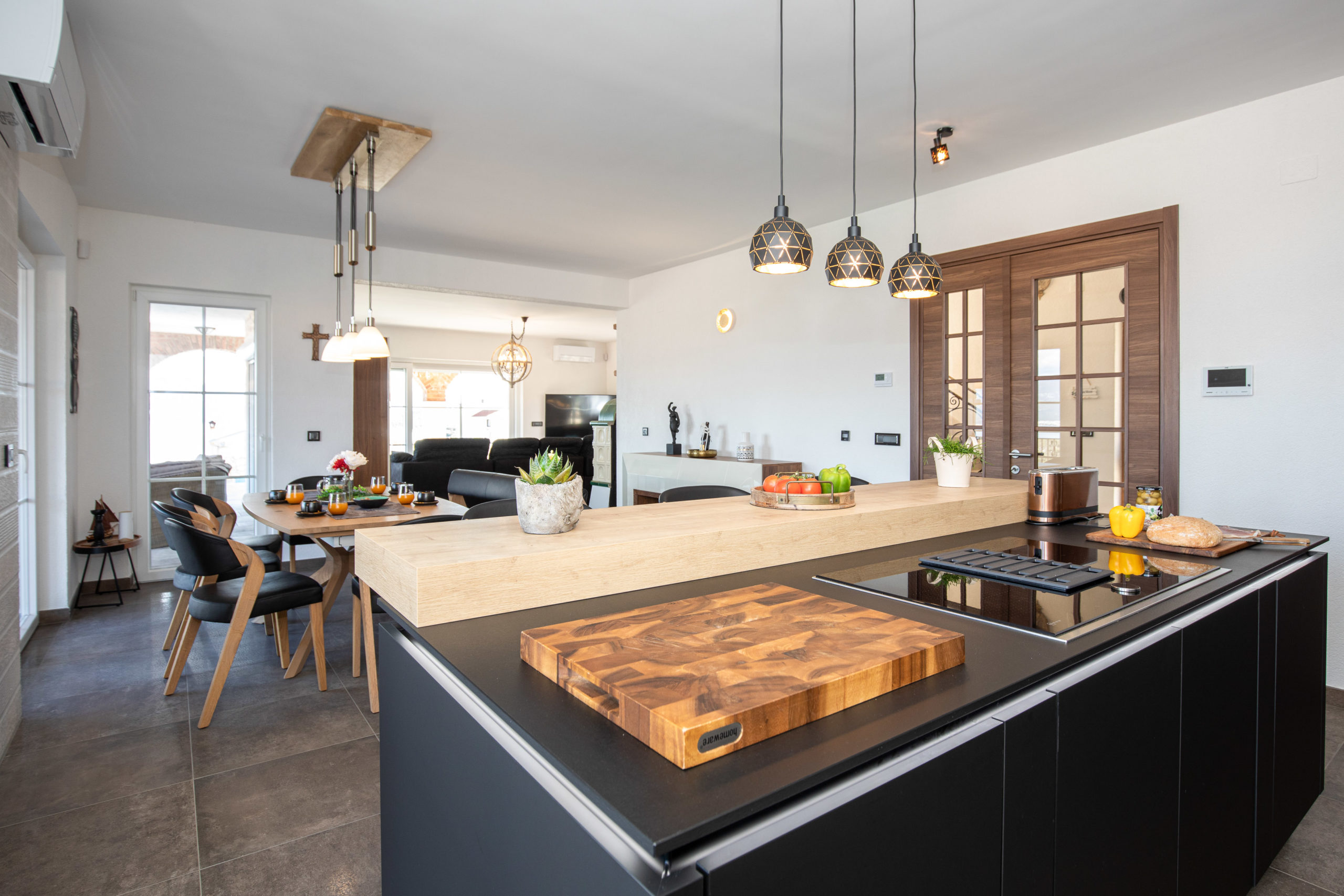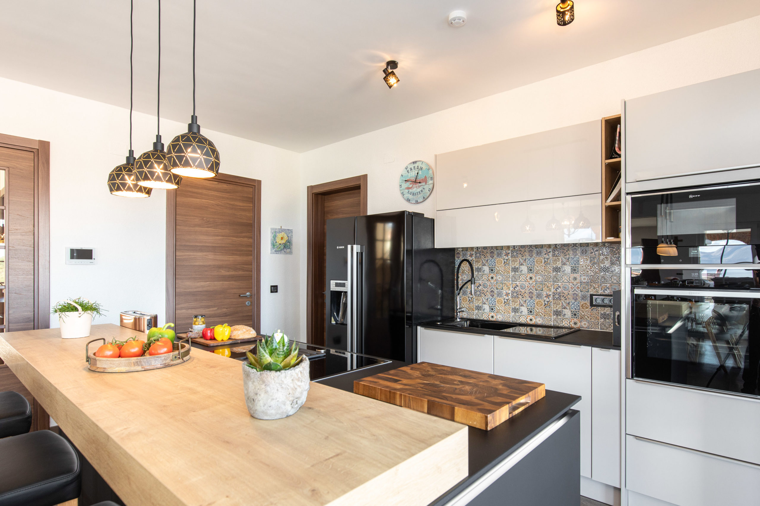 KITCHEN: Open and modern kitchen including living room + table and chairs + stove with oven + microwave oven + fridge + electric kettle + exit to the terrace and Pool with sea and city view.