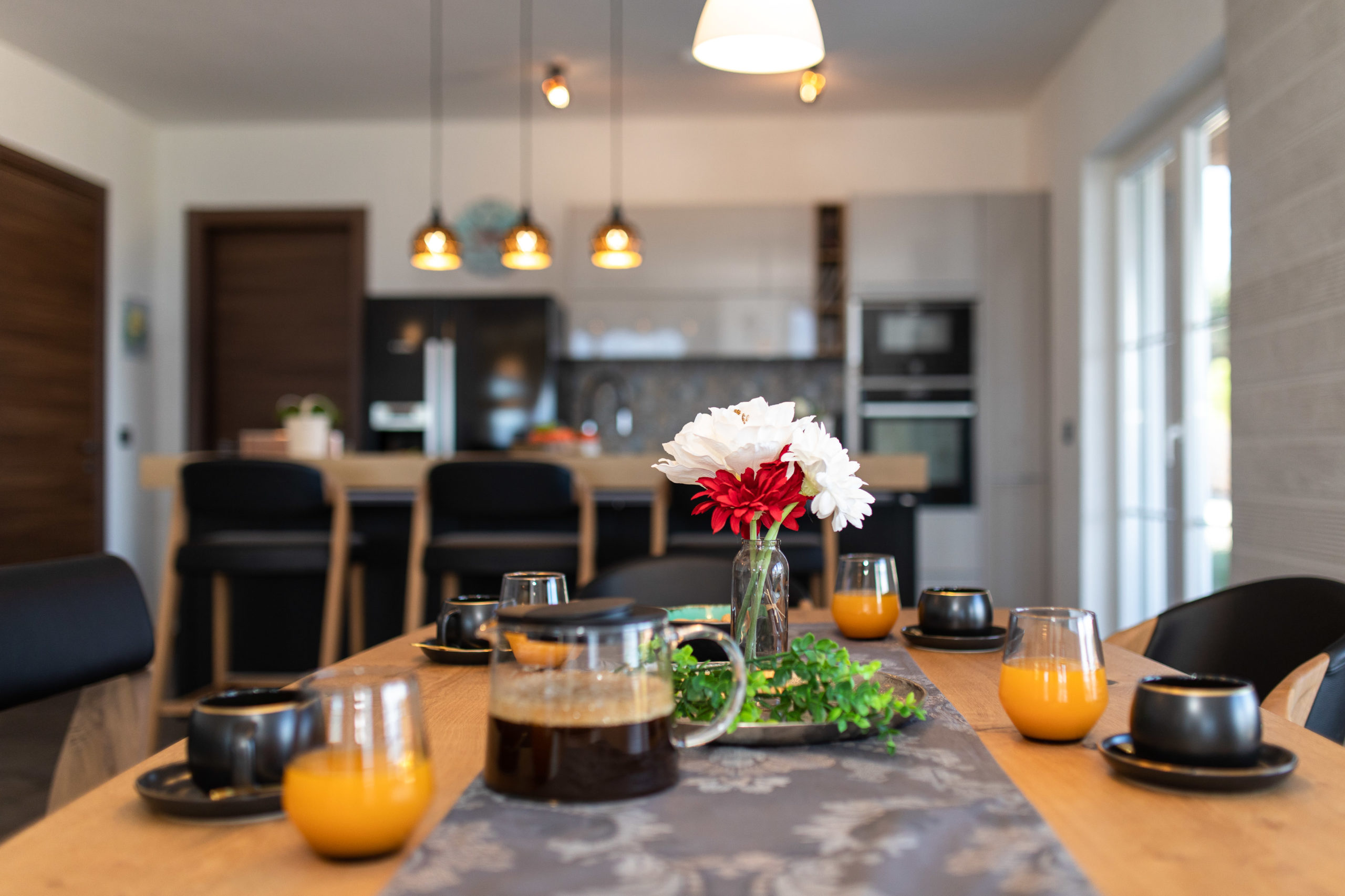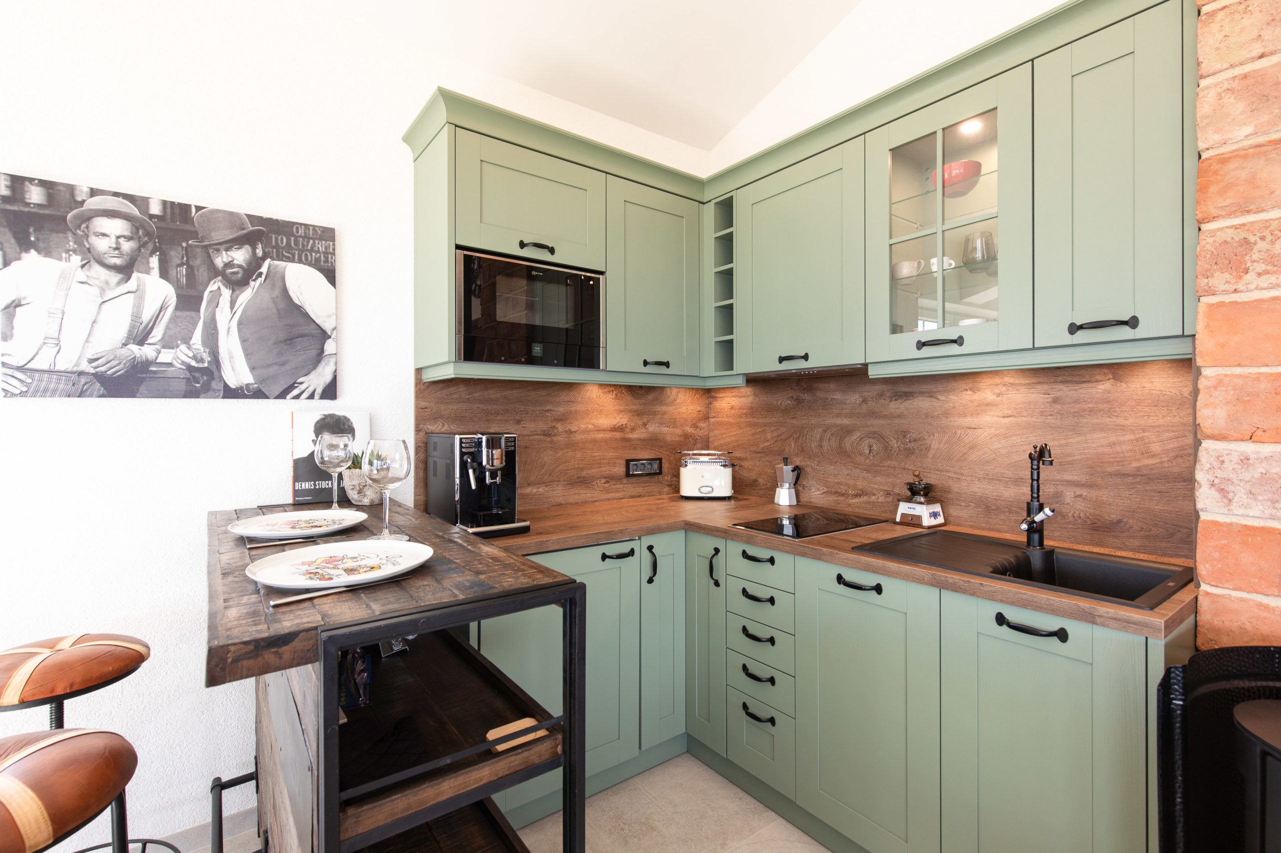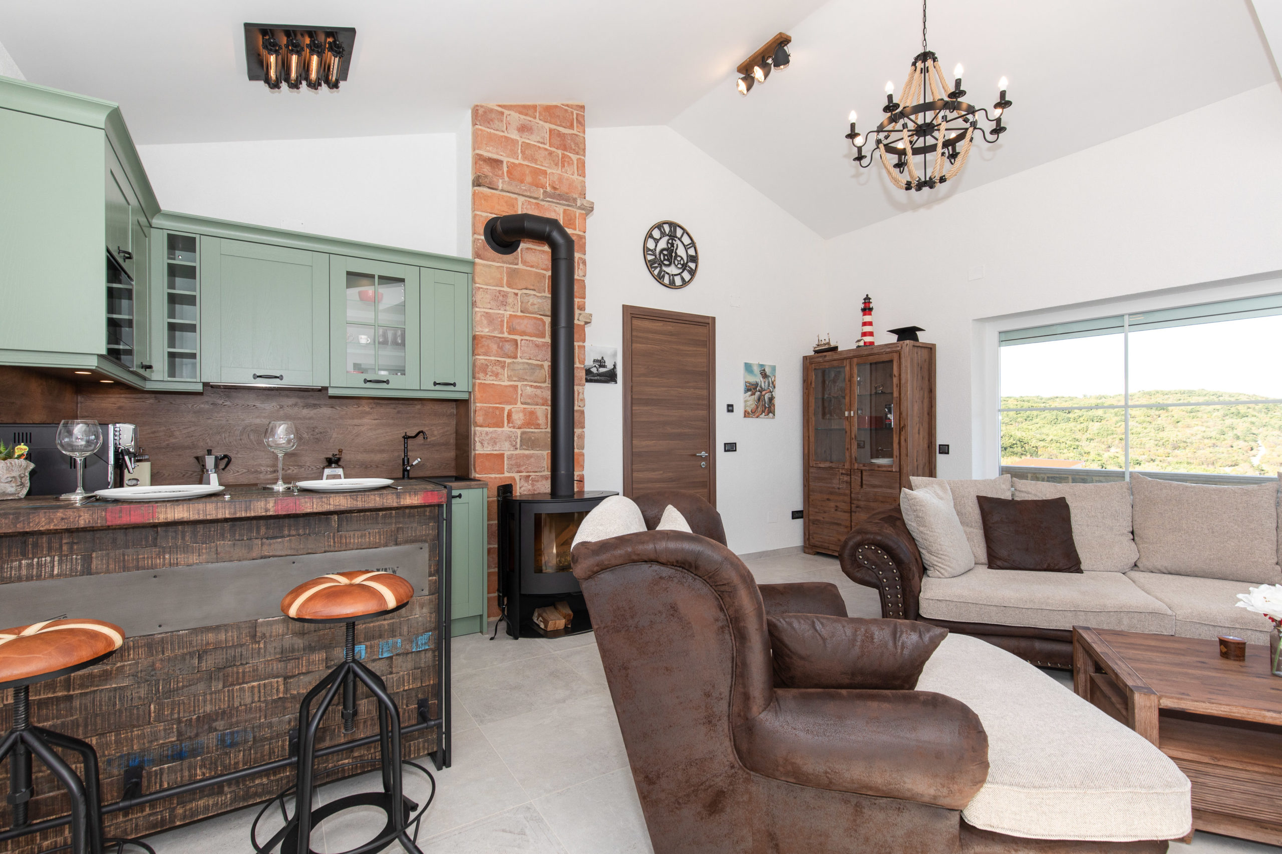 KITCHEN: Summerkitchen including living room + table and chairs + stove with oven + microwave oven + fridge + electric kettle + exit to the balcony with sea and city view.