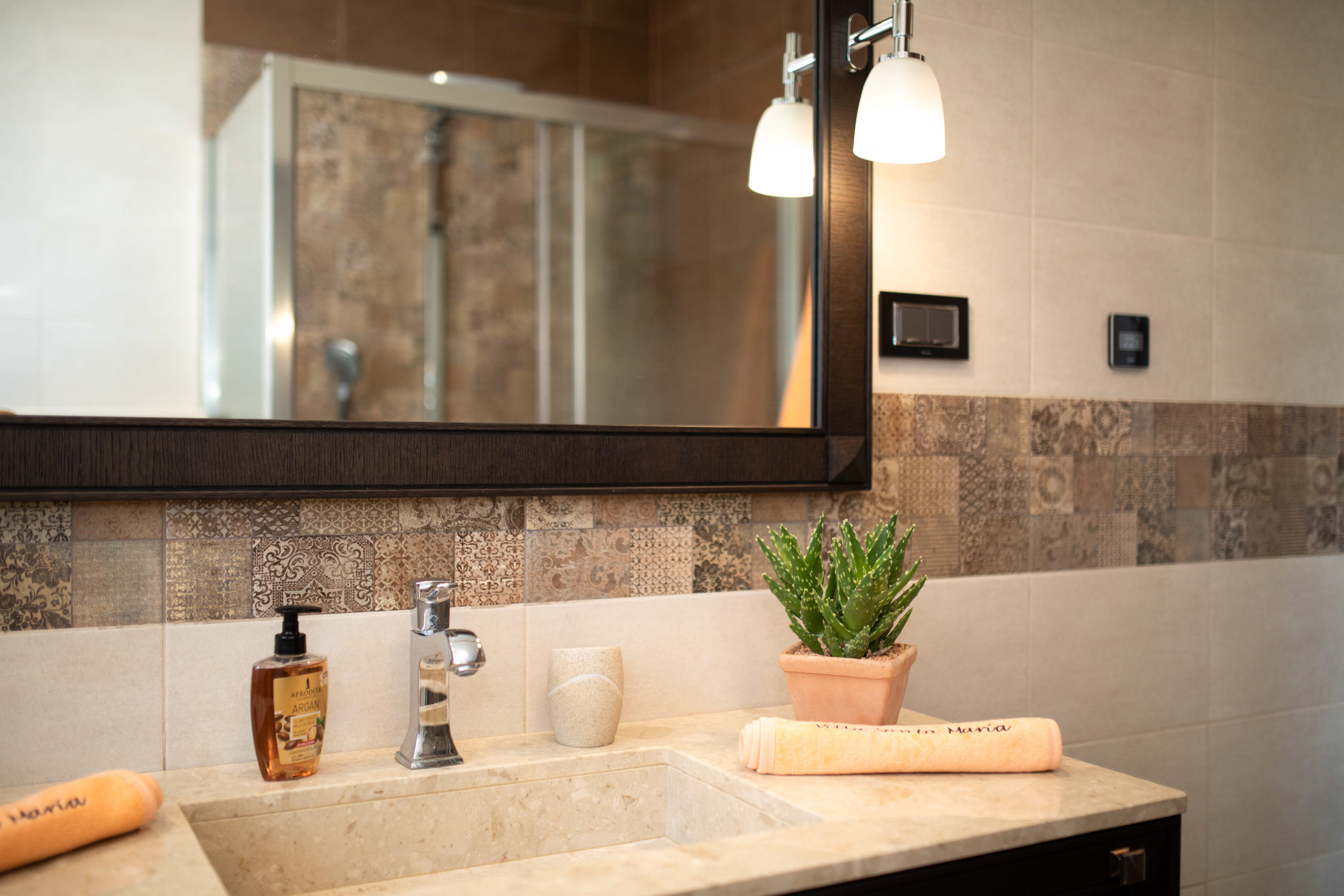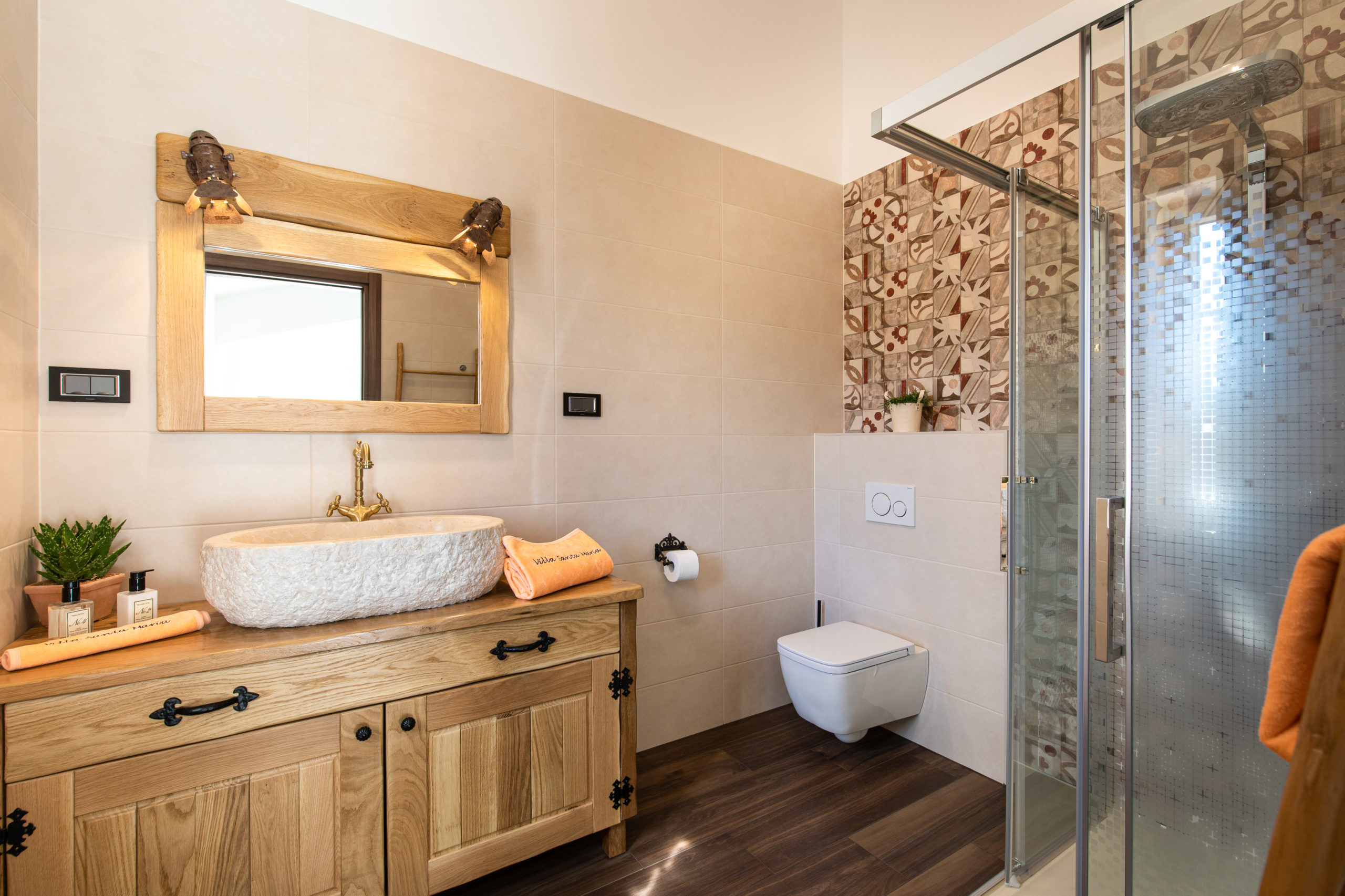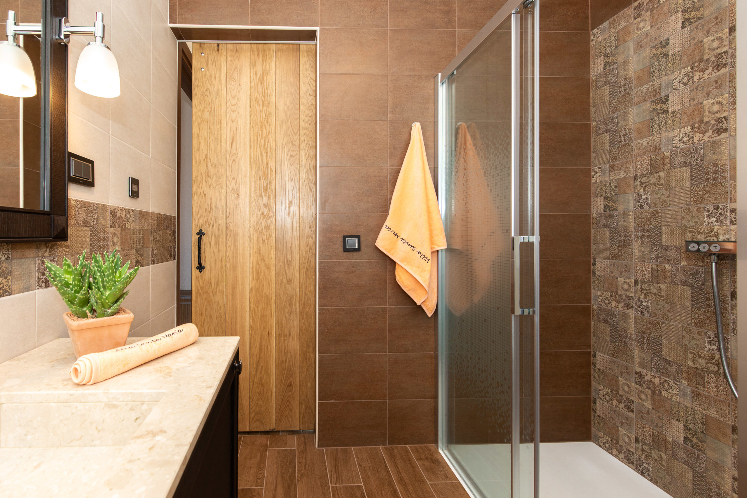 BATHROOM: Shower + Toilet + Hair Dryer + Towels.